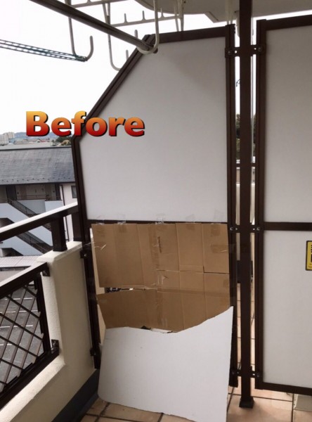 写真はベランダ隔板が強風により破損した被害の修繕になります。