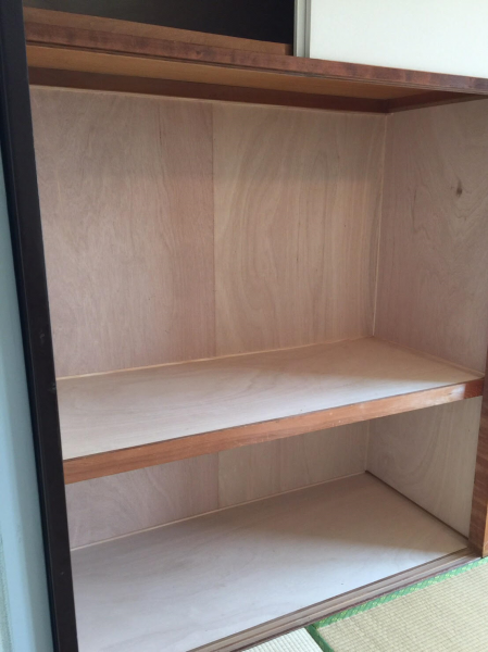 古くなって木が剥がれてしまった押入れも、内側から新しい板を貼り綺麗に修繕。